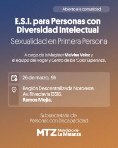 La cita es el jueves 26 de marzo a las 9 horas en la Región Descentralizada Noroeste (Av. Rivadavia 13518, Ramos Mejía). El panel contará con la presencia de la Magister Malvina Veloz y el equipo del Hogar y Centro de Día Color Esperanza, quienes abordarán los ejes de la Ley 26.150: el respeto por la diversidad, la equidad de género, la valoración de la afectividad y el cuidado del propio cuerpo.